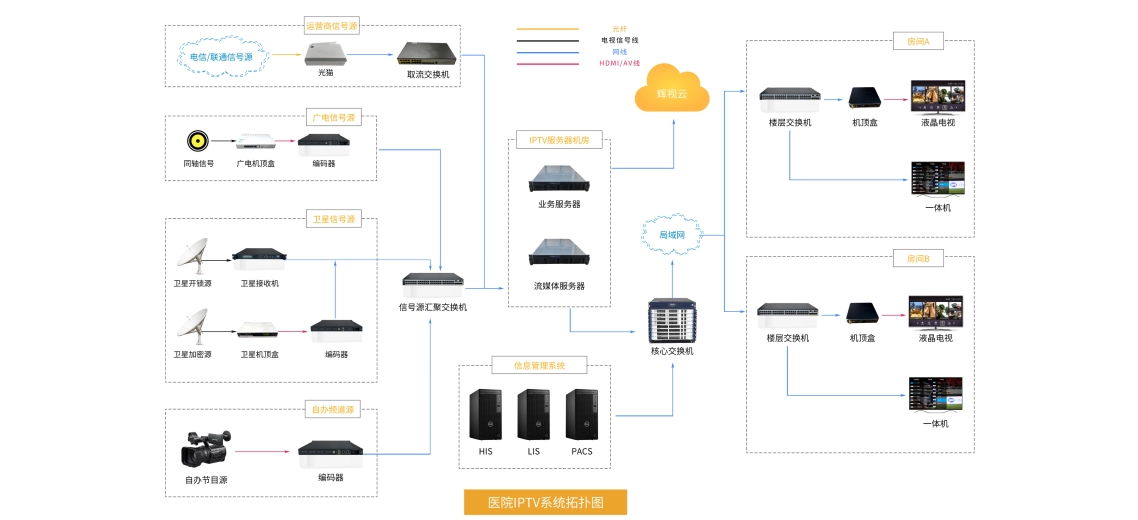 IPTV 在医院项目应用基于现有网络构建,含信号采集编码、内容管理、传输网络及终端设备架构。