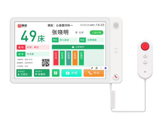 10.1寸病床分机(标准款)专为医疗场景打造,为医护患沟通带来极大便利。其搭载10.1寸高清显示屏,分辨率达1024*600,全触摸操作流畅顺滑,可清晰展示患者所在病区的宣教文章,做到病区针对性宣教内容,护士可通过床头分机向其他医生和护士发出请求支援信号。首页显示患者姓名、性别、年龄、住院号、病情、护理等级、过敏、隔离、护理注意事项等重要信息,可以记录护士进出时间;能自动开/关液晶屏、控制床头灯、支持图像和文字传输、可扩展接入其它外设(如输液报警器等)、有呼叫提示音等。。